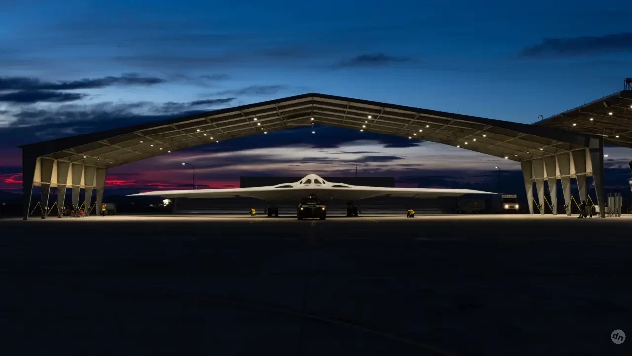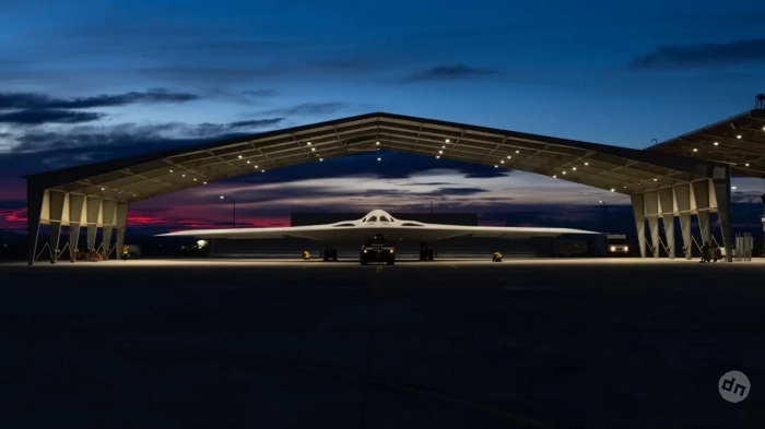B-21 Raider на объекте Northrop Grumman на авиабазе Эдвардс, Калифорния. B-21 — это недавно раскрытое воплощение концепции летающего крыла Джека Нортропа. Предназначенный для замены бомбардировщиков B-1 и B-2 в текущем составе ВВС США, B-21 — это дальний бомбардировщик, способный проникать в воздушные пространства вероятного противника и нести как обычные, так и ядерные боеприпасы.