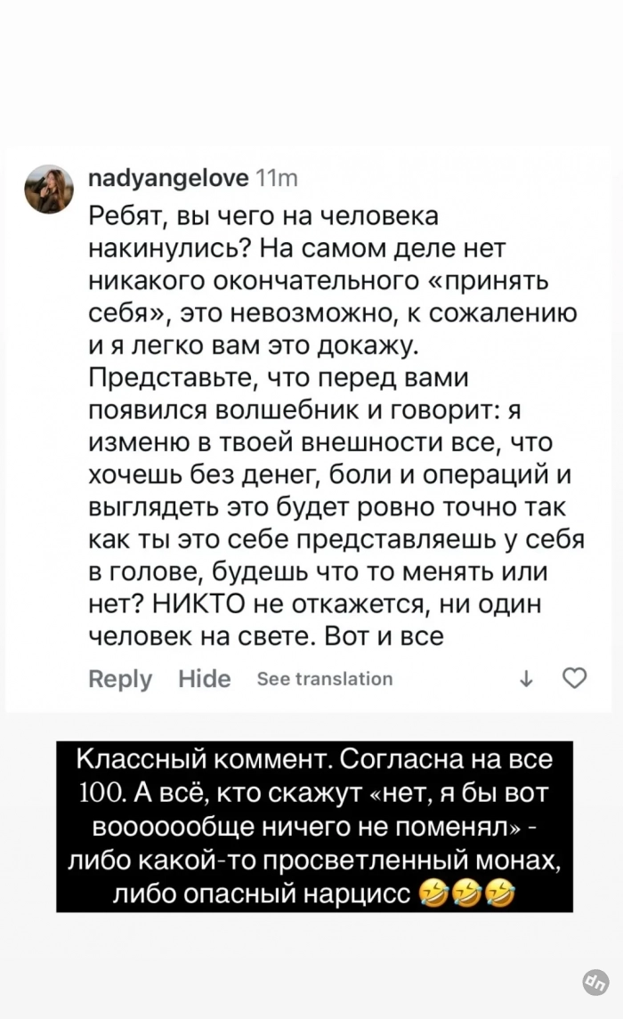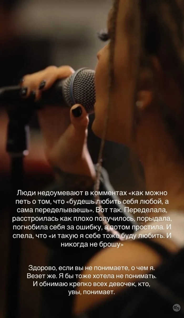 Скриншот из инстаграма* Риты ДакотыСкриншот из инстаграма* Риты ДакотыСкриншот из инстаграма* Риты ДакотыПри этом она заявила, что не собирается из-за новой внешности уходить в тень: "Что же мне делать теперь? Уйти навсегда из соцсетей и со сцены? Закрыться от мира? Не выкладывать больше сниппетов? Или слушать от жестоких баб кучу оскорблений в комментах теперь всю жизнь?". Рита не стала скрывать, что плакала из-за "чужого" лица в отражении, но в итоге решила, что будет любить себя любой, даже "такой вот стрёмной, отёкшей и некрасивой, с уродскими глазами и даже без глаз".