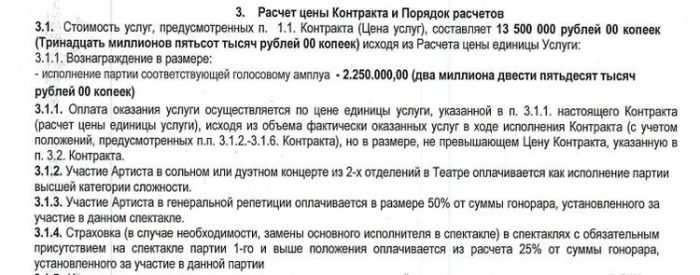 При этом за особо сложные партии предусмотрены доплаты. Выплаченной Нетребко суммы хватило бы на шесть спектаклей без учета доплат и выплат за репетиции. Отработала Нетребко контракт или нет – не ясно, документов об исполнении контракта в системе госзакупок не опубликовано.