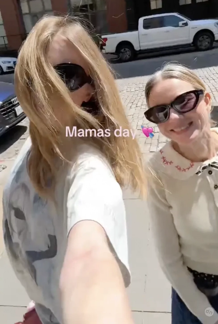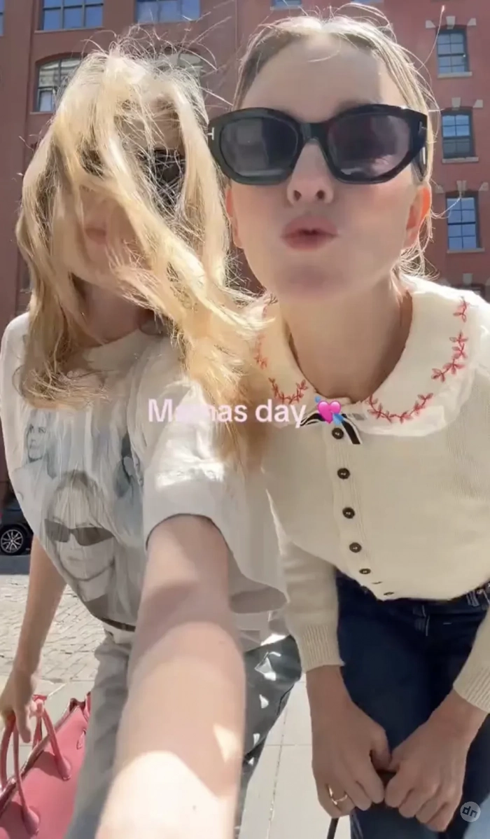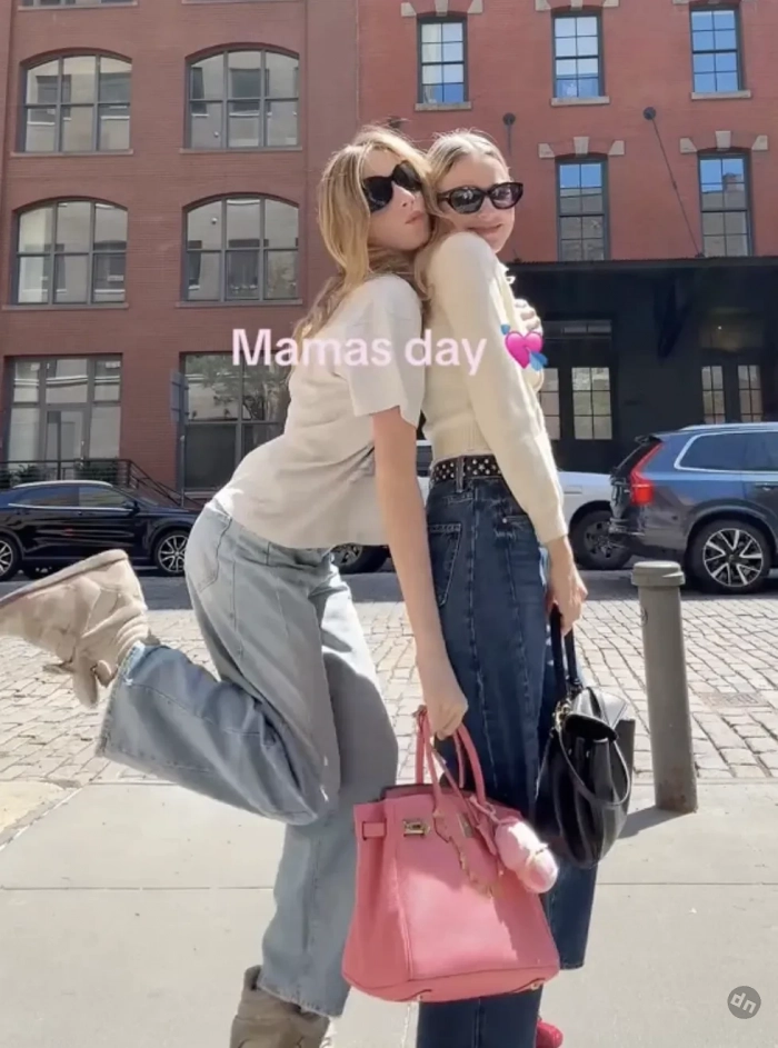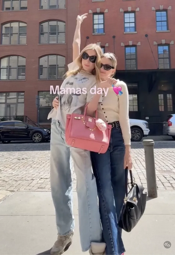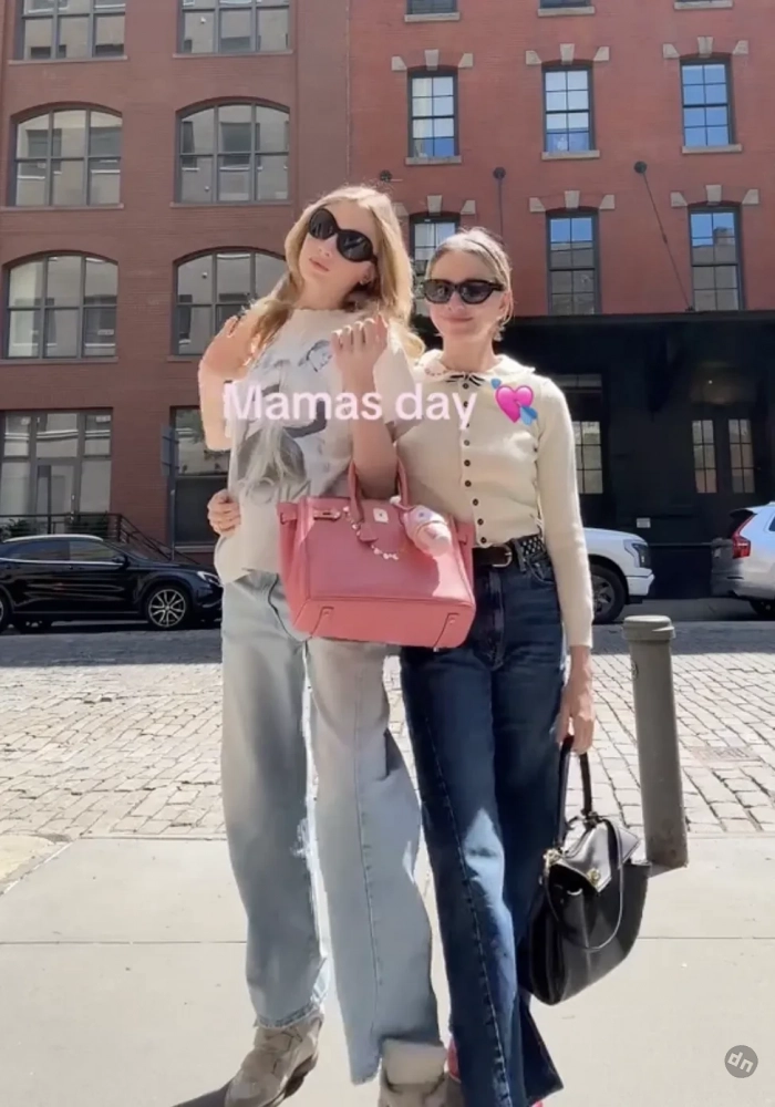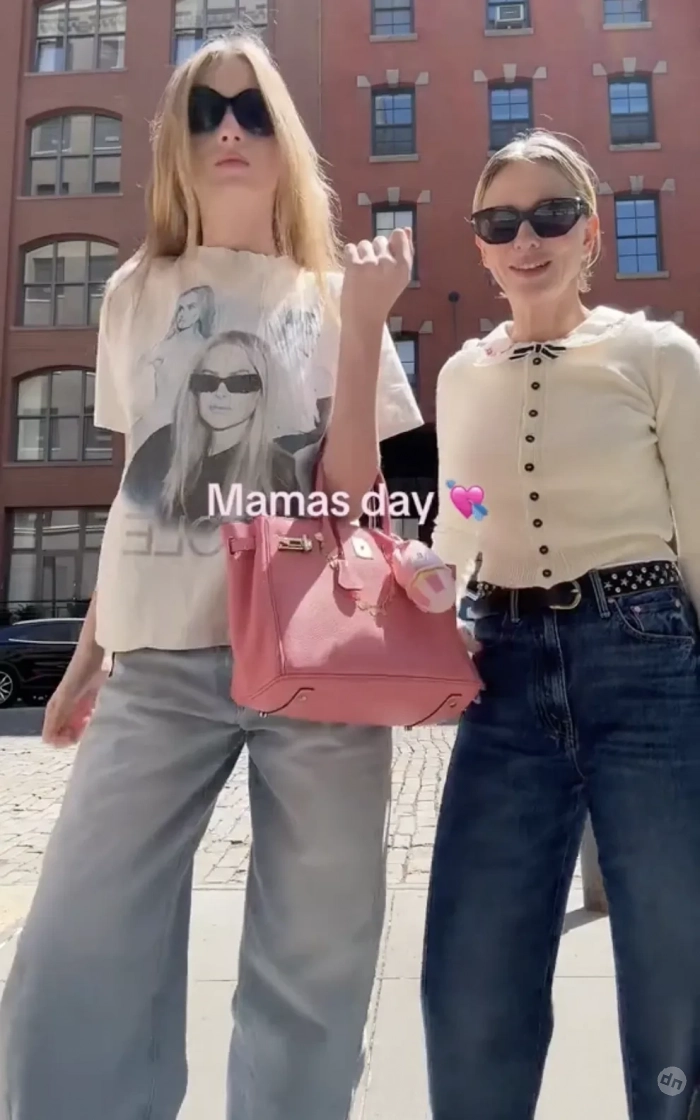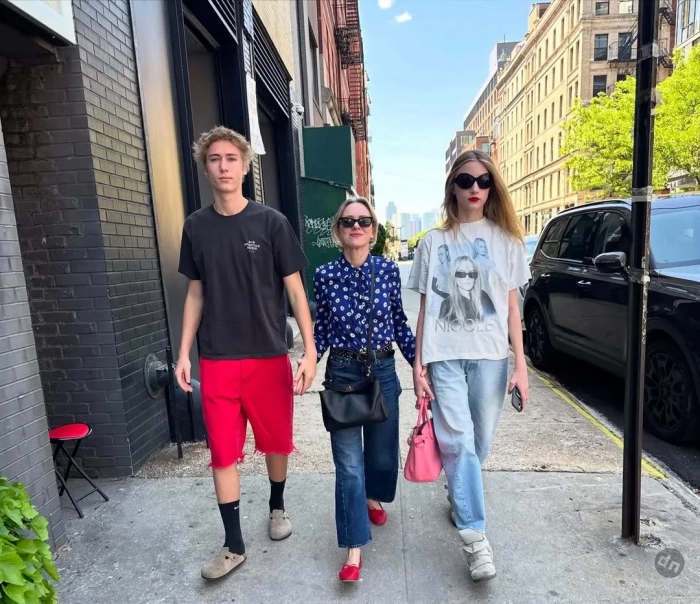 Младший ребёнок актрисы от экс-супруга Лива Шрайбера опубликовал в тиктоке видео со звёздной матерью, снятое на одной из улиц города. Наоми надела на прогулку джинсы с красными балетками и белый кардиган, дополнив образ сумкой Balenciaga. Сын звезды, который недавно начал модельную карьеру, позирует в футболке Balenciaga с изображением Николь Кидман, кроссовках на танкетке Isabel Marant, которые были популярны в 2010-х, а в руках держит розовую сумку Hermes Birkin.