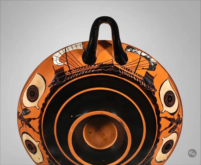 А это греческий килик – чаша для питья, 520 г. до н. э. И на ней изображены корабли того времени. Метрополитен-музей, Нью-Йорк