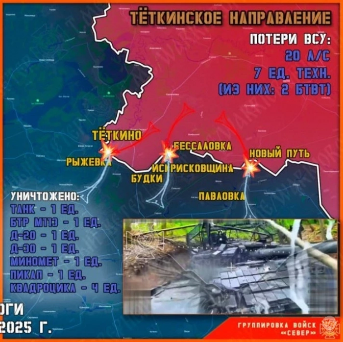 Непосредственно в окрестностях Тёткино остались разрозненные группы оккупантов. Северяне продолжают зачистку приграничных территорий, фиксируя значительное количество тел противников, умерших от потери крови.