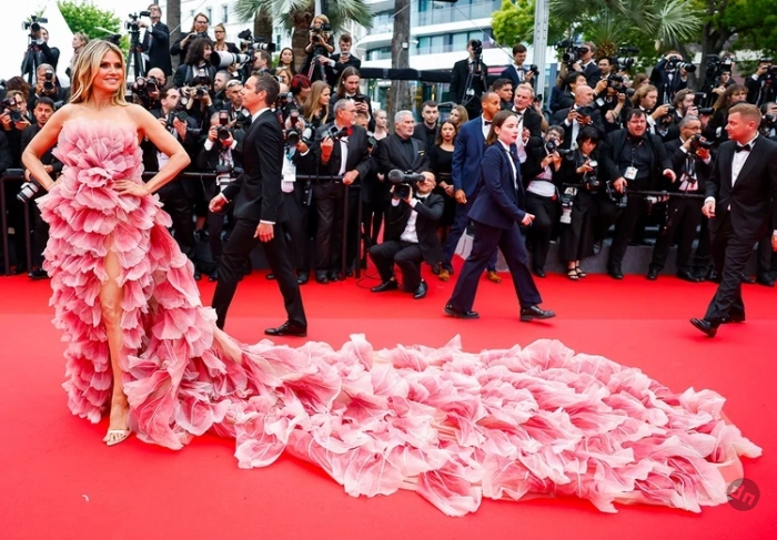 Хайди Клум, как всегда продемонстрировала очень яркий образ. 51-летняя модель надела эффектное цветочное платье с трехметровым шлейфом.