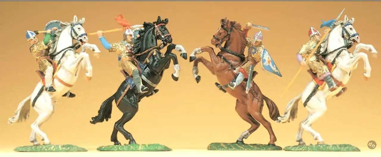 Норманны-всадники. Так выглядели все рыцари-феодалы в Европе этого периода. Компания Preiser (Elastolin) ФРГ. 90-е гг. ХХ в. Компания номер один среди производителей солдатиков