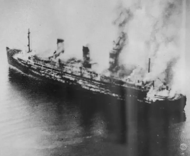 Горящий немецкий лайнер «Кап Аркона» вскоре после начала атаки британских самолетов