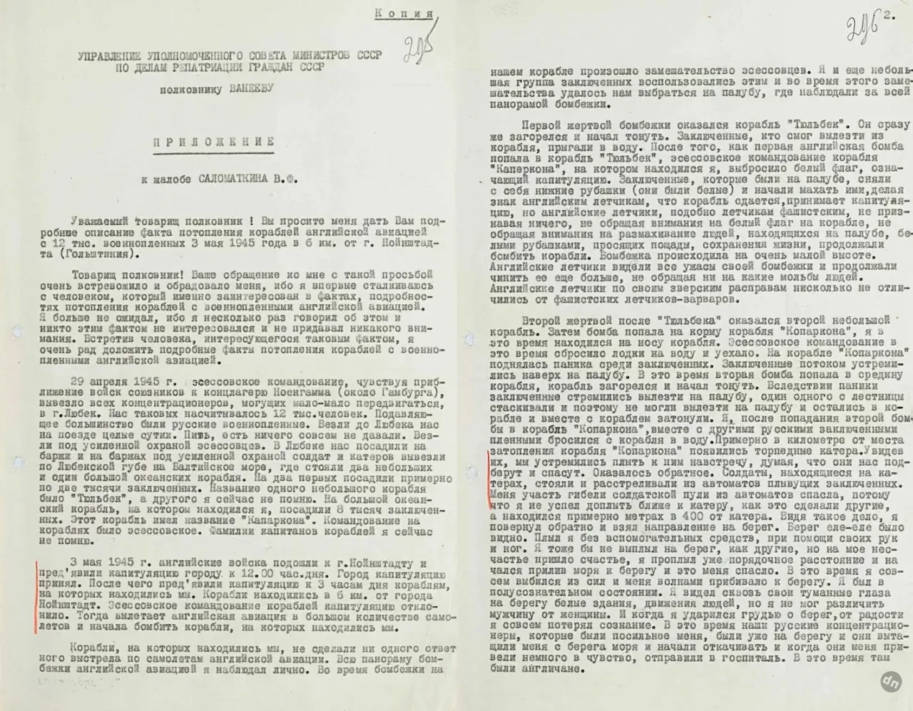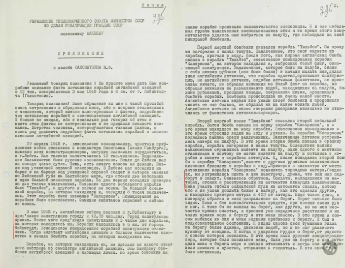 «Первой жертвой бомбёжки оказался корабль «Тюльбек», эсэсовское командование корабля «Кап Аркона», на котором находился я, выбросило белый флаг, означающий капитуляцию. Заключённые, которые были на палубе, сняли с себя нижние рубашки (они были белые) и начали махать ими, делая знак английским лётчикам, что корабль сдаётся, принимает капитуляцию, но английские лётчики, подобно лётчикам фашистским, не признавая ничего, не обращая внимания на белый флаг на корабле, не обращая внимания на размахивание людей, находящихся на палубе, белыми рубашками, просящих пощады, сохранения жизни, продолжали бомбить корабли. Бомбёжка происходила на очень малой высоте. Английские лётчики видели все ужасы своей бомбёжки и продолжали чинить её ещё больше, не обращая внимания ни на какие мольбы людей. Английские лётчики по своим зверским расправам нисколько не отличаются от фашистских лётчиков-варваров».