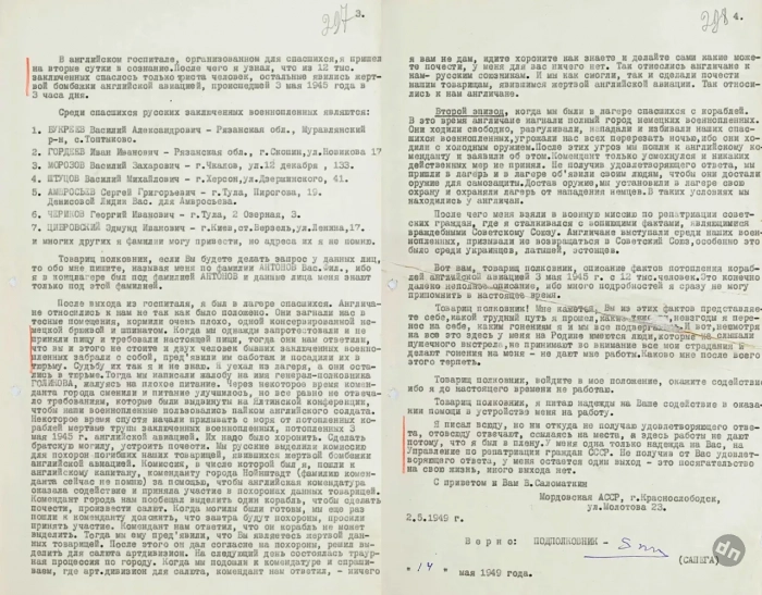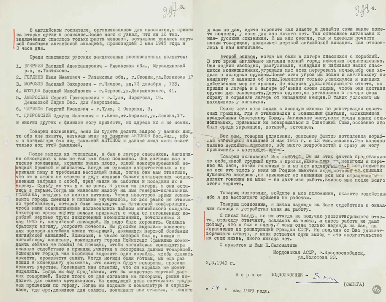 Новые подробности этой трагедии оказались известны благодаря обнаруженному в архивах письму одного из узников концлагерей, которое находилось в материалах переписки МГБ СССР с управлением уполномоченного Совета министров СССР по делам репатриации советских граждан за 1949 год. Письмо написано от имени непосредственного участника трагедии 3 мая 1945 года Василия Саломаткина (1919–1999).
