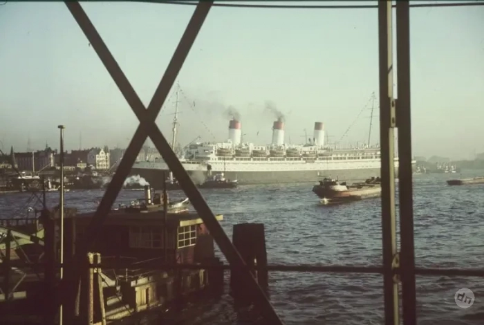 Немецкий пассажирский лайнер «Кап Аркона» (Cap Arcona) в порту Гамбурга. С 1940 по 1942 гг. судно использовалось как плавучая казарма. В 1945 году использовалось как плавучая тюрьма.