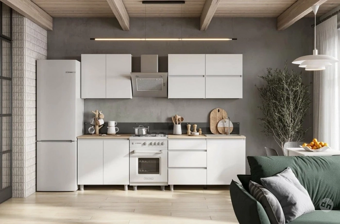 Кухонный гарнитур Hoff в белом цвете с фасадами «белый софт» — грамотное решение для тех, кто ищет баланс между стилем, функциональностью и бюджетом. Компактная длина в 240 см при разумной глубине модулей позволяет рационально использовать даже небольшое пространство. Гарнитур включает верхние и нижние шкафы, а также тумбу под духовой шкаф — идеальный набор для базовой кухни. Отличный пример того, как выбрать мебель для кухни, чтобы получить максимум за разумные деньги.