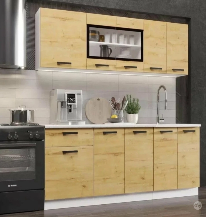 Кухонный гарнитур от Hoff в цвете дуб золотой — это практичный и эстетичный вариант для тех, кто ищет продуманное решение в среднем ценовом сегменте. В рейтинг мебели для кухни этот комплект заслуженно попадает благодаря сбалансированному сочетанию функциональности и визуальной выразительности. Он включает четыре ключевых модуля и столешницу, что позволяет быстро обустроить компактную кухню без лишней суеты. Высокие навесные шкафы обеспечивают максимум полезного пространства, а нижние столы удобны в повседневной эксплуатации. Отличный выбор для квартир с ограниченной площадью.