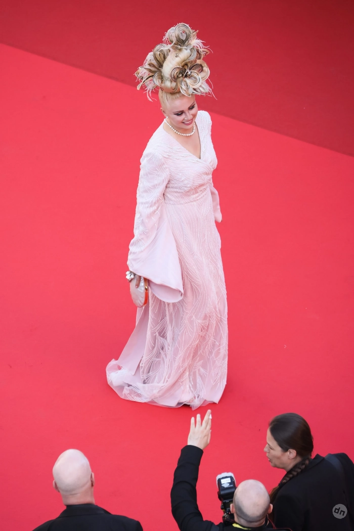 Ирина Шейк появилась на красной дорожке в кастомном чёрном платье с перьями Elie Saab. Лена Ленина, пропустившая церемонию открытия, выбрала для выхода нежно-розовое платье и высокую футуристичную причёску.