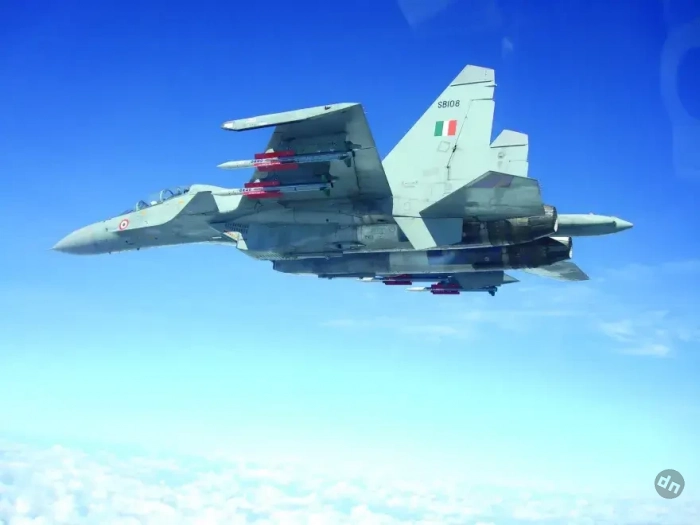 Су-30МКИ ВВС Индии с ракетой Р-73, установленной на законцовке крыла, и ракетами Р-77 и Р-27, установленными внутри.