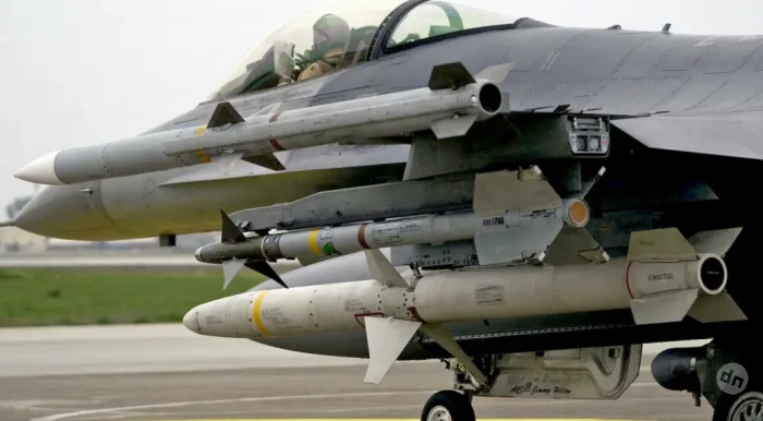 Самолёт F-16C ВВС США несёт на законцовке крыла ракету AIM-120C AMRAAM, на крайнем подкрыльевом пилоне — ракету AIM-9L/M Sidewinder, а на среднем подкрыльевом пилоне — ракету AGM-88 HARM. ВВС США
