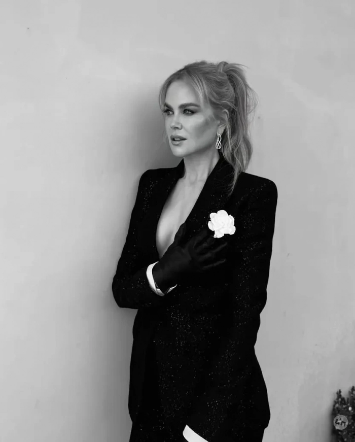 Николь Кидман посетила премьеру второго сезона сериала "Девять совсем незнакомых людей" в Беверли-Хиллз. На дорожку 57-летняя актриса вышла в чёрном жакете Tom Ford, надетом на голое тело, и брюках, дополнив образ перчатками в тон и причёской с высоким хвостом.