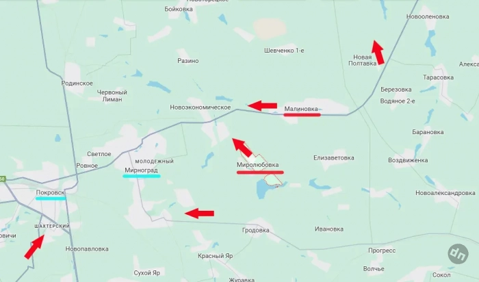 ВСУ потеряли территории в районе Новой Полтавки к северо-востоку от Покровска (Красноармейска), Новосергеевки (у границы с Днепропетровской областью). Также наши войска продвигаются в сторону Новоэкономического – пригорода Мирнограда. Продвижение идёт как с юга, со стороны ранее освобождённой Миролюбовки, так и с востока – от Малиновки, которая так же освобождена армией России.