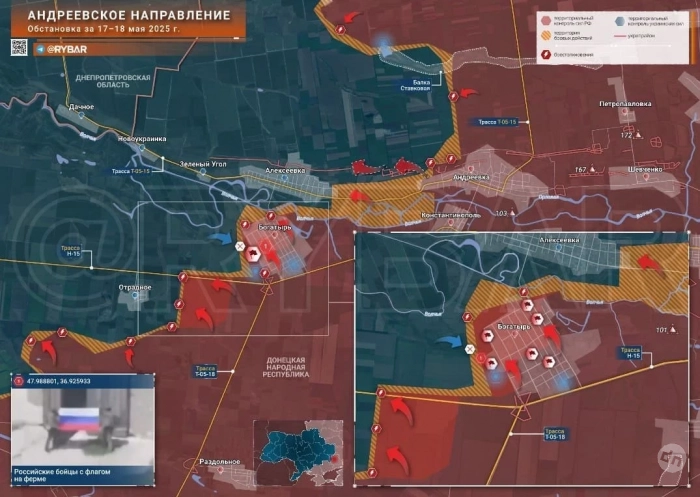 Западнее Торецка российские подразделения перерезали трассу на Константиновку в районе Новооленовки и продвигаются к Полтавке. По оперативным данным, наши войска, продвигаясь широким фронтом, вышли к окраинам Яблоновки. Восточнее наши бойцы ведут ожесточенные бои в большом кармане, пытаясь заблокировать ВСУ по рубежу Александрополь-Заря-Романовка. Для этого наши штурмуют Романовку и пробиваются к Заре. Этот клин опасен для ВСУ тем, что он угрожает Покровску с востока и формирует охват района Александро-Калиново -Клебан-Бык в предполье Константиновки. Восточнее Торецка идут бои в посёлке Дылеевка.