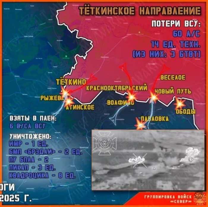 Враг предпринял одну из самых массированных атак с участием десятков штурмовиков и семи единиц техники на направлении Тёткино, а также несколько попыток вторжения на нашу территорию пешими группами на соседних участках. Северяне отразили все попытки прорыва врага, уничтожив большую часть военной техники и живой силы ВСУ.