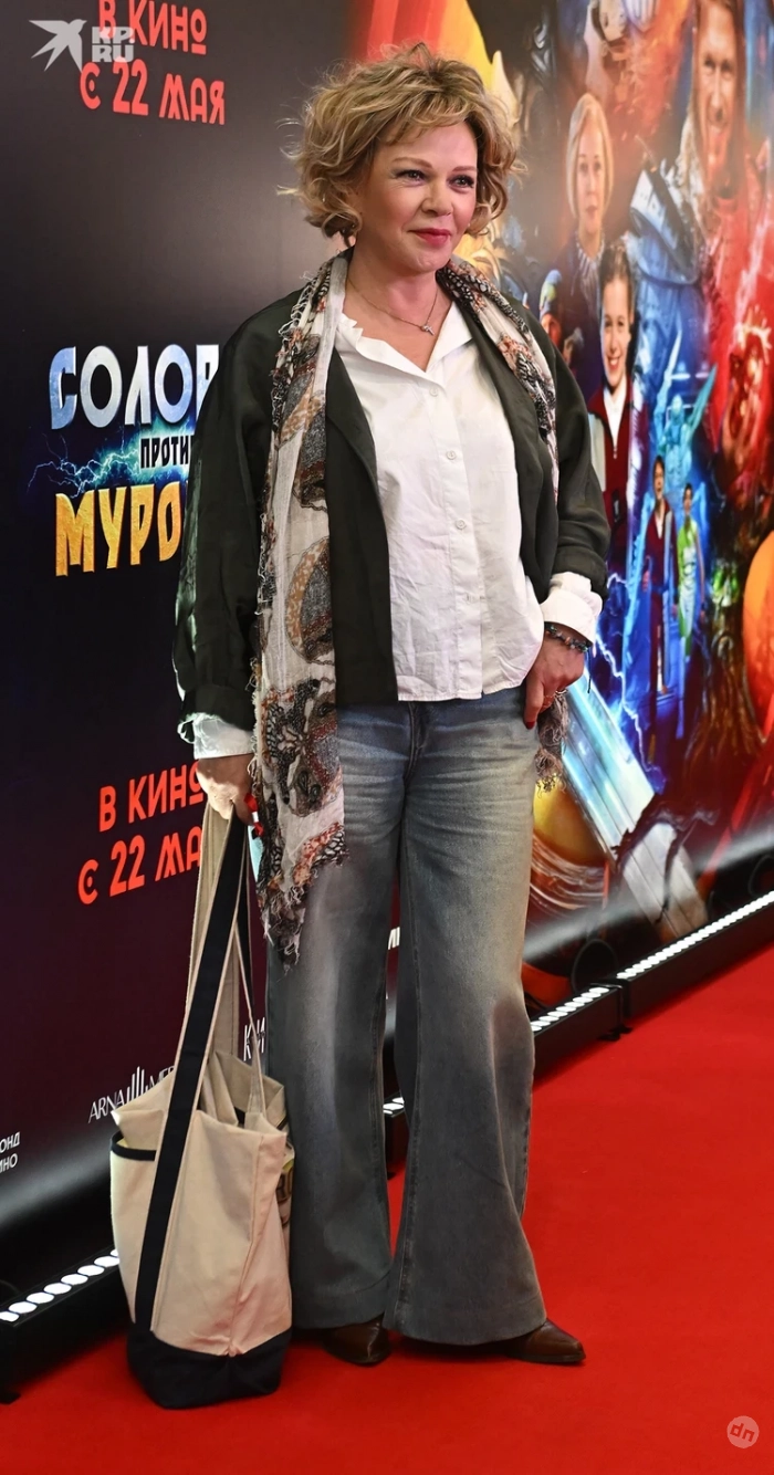 62-летнюю Елену Валюшкину мы увидим в роли бабушки. Для дорожки актриса выбрала расслабленный образ — белую рубашку она сочетала с джинсами и блейзером, а на шею накинула платок.