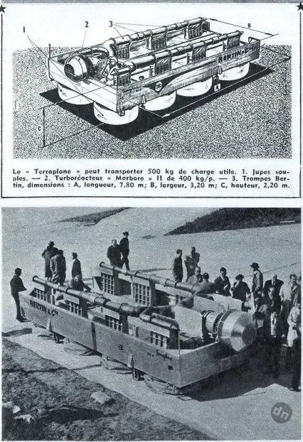 Terraplane BC4 совсем не походил на транспортное средство для дорог общего пользования. Это была грузовая платформа, размещенная на восьми гибких юбках или фартуках, в которые нагнетался воздух. Всё это хозяйство приводилось в движение реактивным двигателем Turbomeca Marbore. Уникальность конструкции Жана Бертена заключалась в этих самых фартуках, которые могли наклоняться в любую сторону. Угол наклона был небольшой, но он позволял машине на воздушной подушке разгоняться до нескольких десятков километров в час. При этом судно парило над поверхностью на высоте 3-4 см. Получался корабль со своеобразной системой изменяемого вектора тяги.