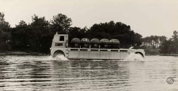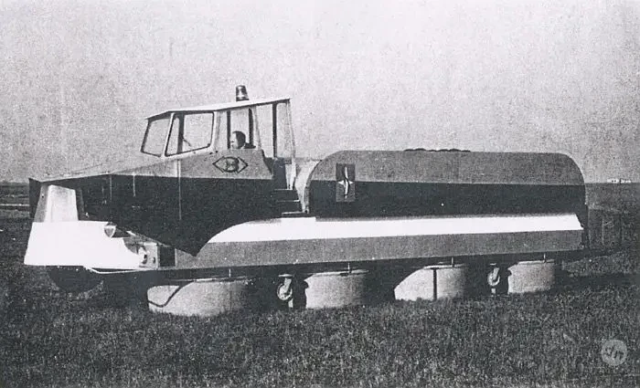 Именовалась она Terraplane BC6 (кто-то потеряли промежуточный индекс BC5) и неё отсутствовал турбореактивный двигатель. Взамен аппарат получил пару бензиновых оппозитных Porsche и один дизель Panhard. Это значительно повысило топливную экономичность BC6, а заодно и сопутствующий шум. Первые два отвечали за нагнетание воздуха под днище, дизель обеспечивал движение. Внешность у аппарата получилась своеобразная – что-то среднее между катером, тепловозов и баржей. Terraplane все также опирался на восьми гибких фартуков, но дополнительно получил по одному колесу спереди и сзади. Они должны были направлять транспортное средство по курсу и обеспечивать торможение конструкции полной массой в три тонны. Заднее колесо было ведущим, крутящий момент на него подавался от дизеля Panhard. Вместе с фирменной системой Бертане с отклоняемыми фартуками, это обеспечивало уверенную тягу. На стоянке при неработающем двигателе BC6 опирался на четыре колеса от гипертрофированной тележки из супермаркета. Кабина экипажа больше походила на рубку, но защищала от ветра и осадков. Аппарат появился на свет в 1963 году, мог ходить (или летать?) автономно до 200 км с грузом массой в 1400 кг. Очень неплохо, если учесть, что снаряженная масса BC6 составляла 1600 кг. На суше машина делала 70 км/ч, на воде – 25 км/ч.