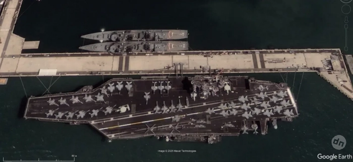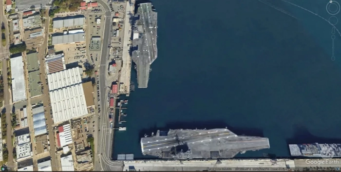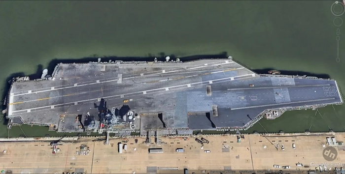 Спутниковый снимок Google Earth: авианосец USS John F. Kennedy (CVN-79) на верфи Newport News Shipbuilding. Снимок сделан в марте 2025 года