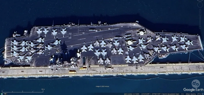 Спутниковый снимок Google Earth: авианосец USS Carl Vinson (CVN-70) на стоянке военно-морской базы Перл-Харбор. Снимок сделан в феврале 2024 года