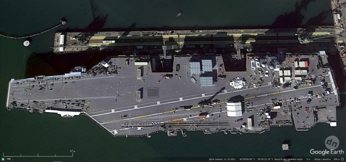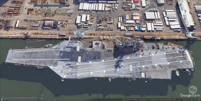 Спутниковый снимок Google Earth: авианосец USS Gerald R. Ford (CVN-78) на верфи Newport News Shipbuilding. Снимок сделан в ноябре 2021 года