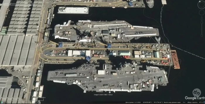 Спутниковый снимок Google Earth: авианосец USS George Washington (CVN-73) на верфи Newport News Shipbuilding. Снимок сделан в апреле 2023 года