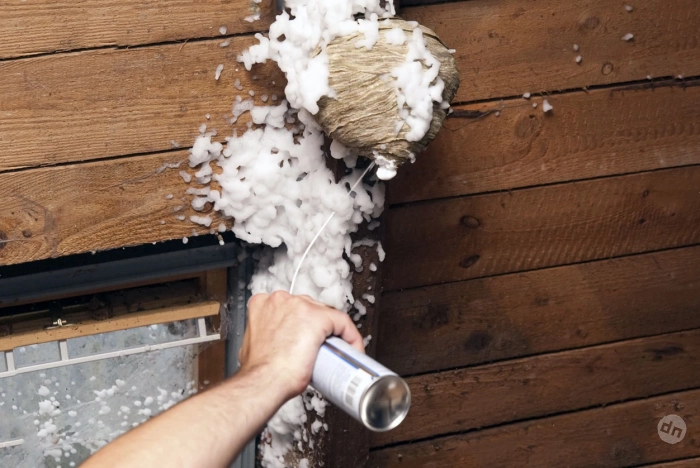 Используйте инсектицид в баллончике. Обрабатывайте гнездо вечером, когда осы становятся менее активны. Наденьте плотную одежду, очки и перчатки.