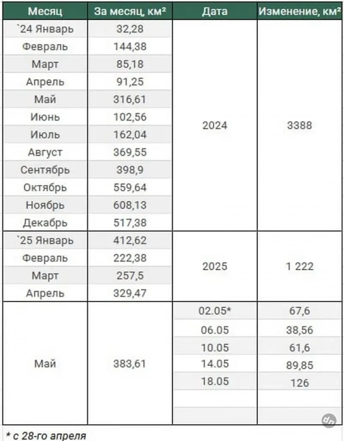 Согласно подсчетам, за первые четыре месяца 2025 года российские войска освободили территорию площадью 1222 кв. километра, тогда как за весь 2024 год — 3388 кв. км.