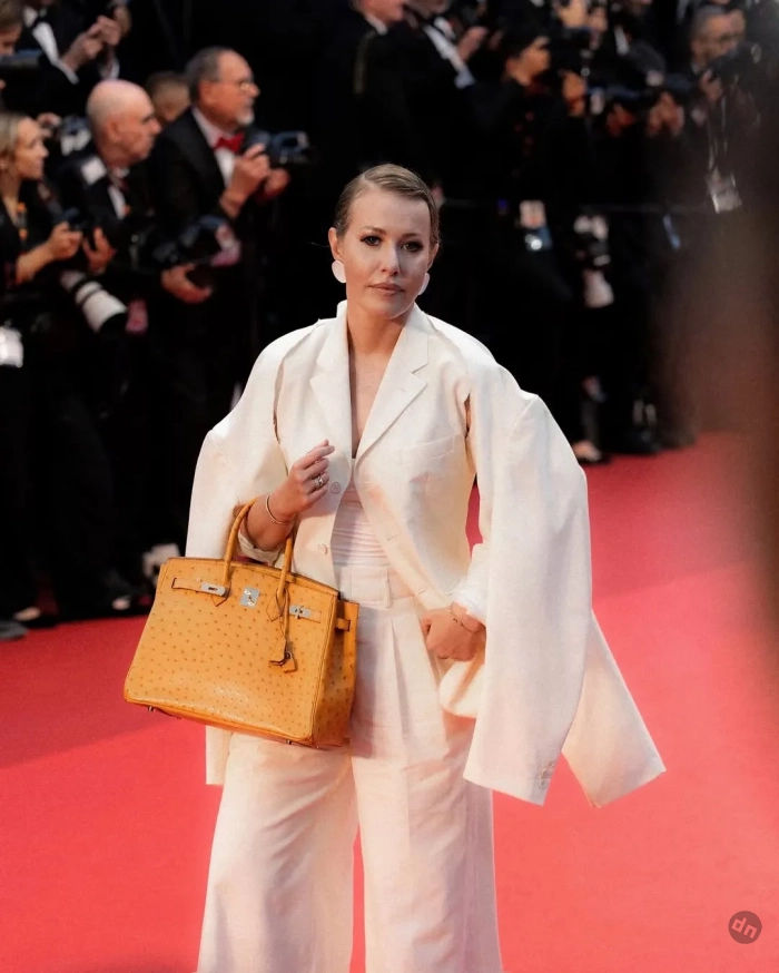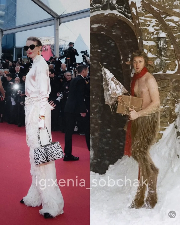 Ксения Собчак в этом году снова прилетела на фестиваль и посетила несколько премьер. На дорожку фильма "Два прокурора" 43-летняя ведущая вышла в тотал-луке Prada, надев платье с перьями с оранжевой ветровкой. На премьеру "Умри, моя любовь" Ксения пришла в "смирительной" рубашке-пиджаке Comme des Garçons и с сумкой Hermes Birkin, а на показе "Досье 137" позировала в костюме с "пушистыми" брюками Phoebe Philo и сумкой Prada. Свой образ Ксения иронично сравнила с персонажем Мистером Тумнусом из "Хроник Нарнии". На просмотр фильма "Эддингтон" Ксения пришла "на скромном": в платье Prada и пальто Comme des Garçons, дополнив образ меховой сумкой Maison Margiela.