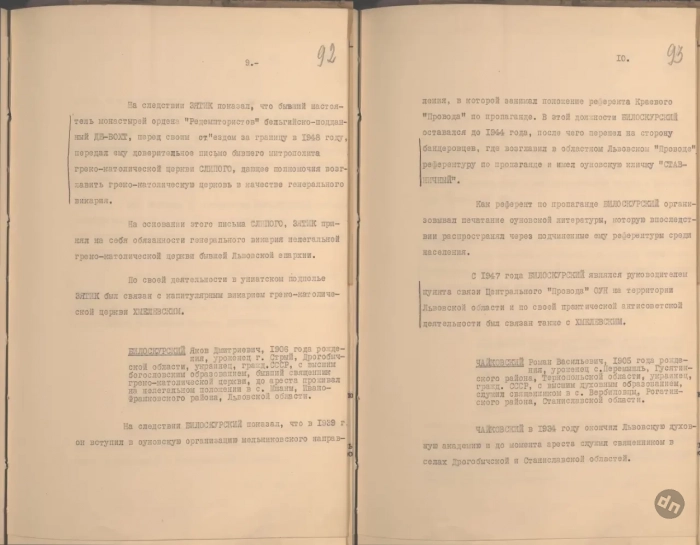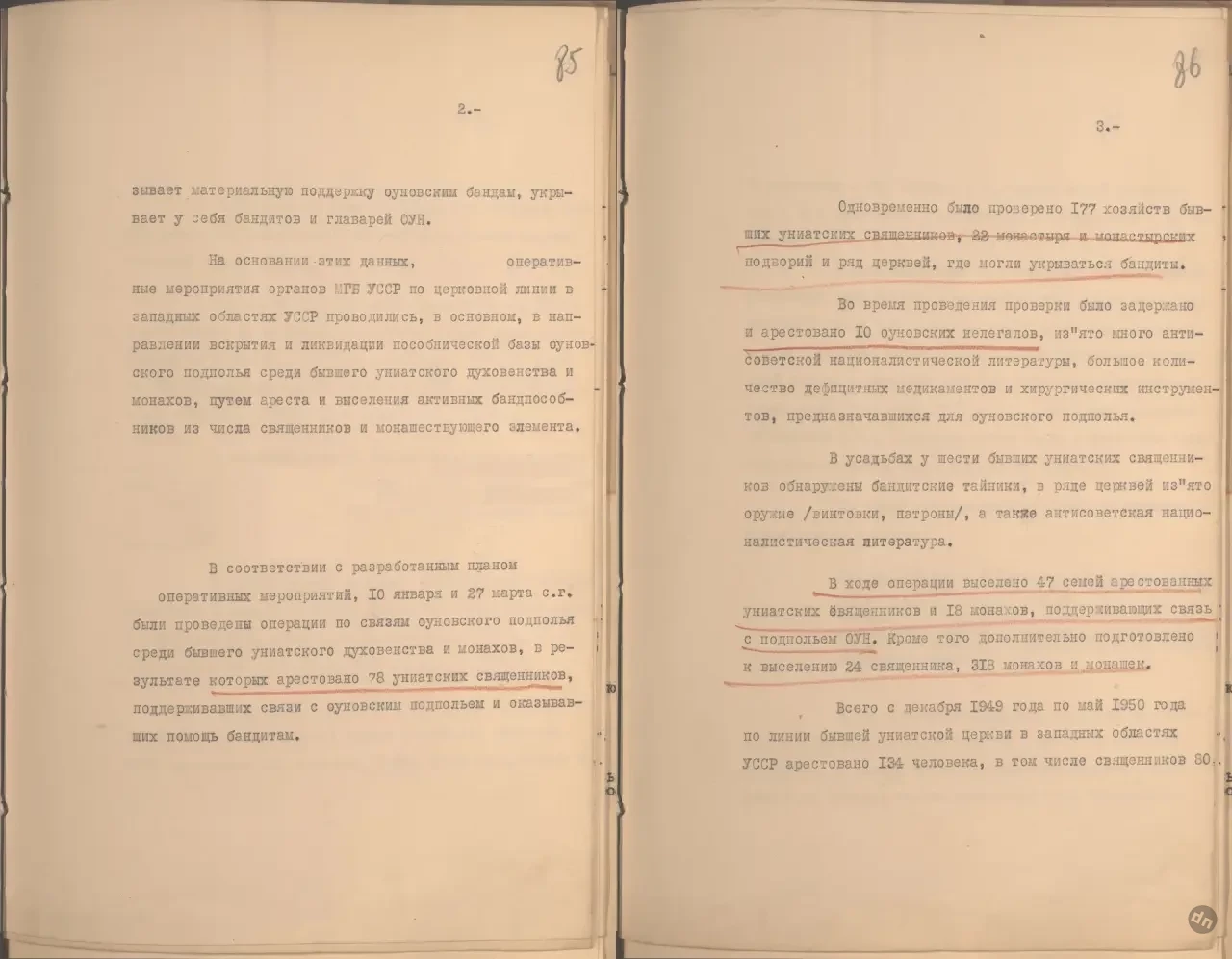 Поэтому органы советской госбезопасности проводили мероприятия в западных областях Украины «в основном в направлении вскрытия и ликвидации пособнической базы оуновского подполья среди бывшего униатского духовенства и монахов путём ареста и выселения активных бандпособников из числа священников и монашествующего элемента».