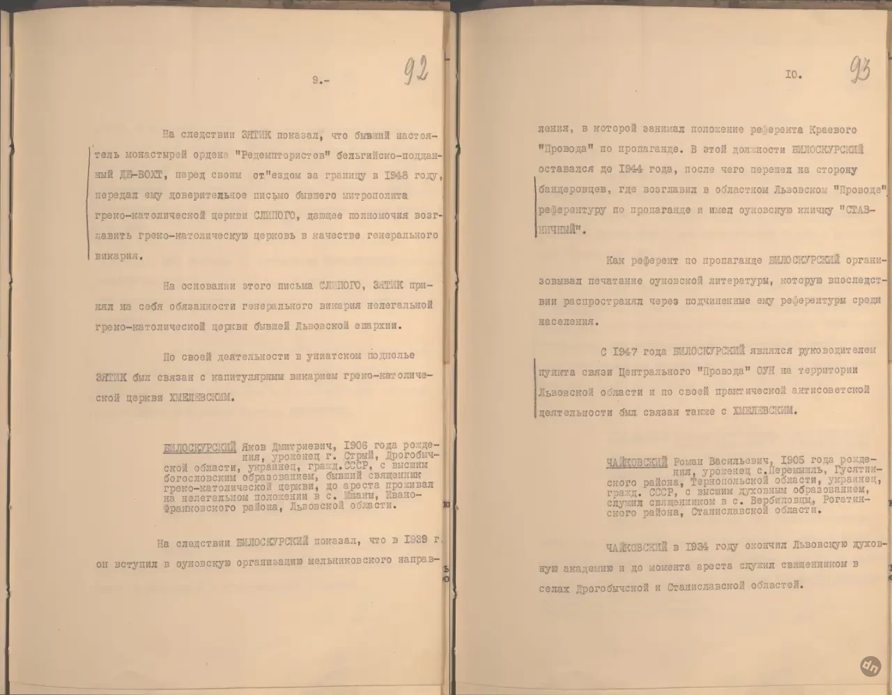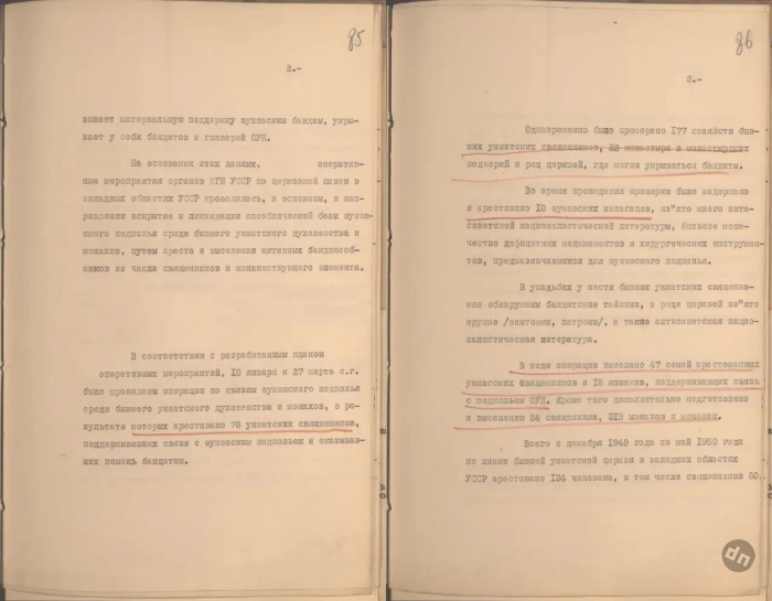 «В процессе оперативной работы по бывшему униатскому духовенству в западных областях Украины в МГБ (Министерство государственной безопасности. — Автор) УССР поступали данные, свидетельствовавшие о том, что значительная часть духовенства и монашествующего элемента бывшей греко-католической (униатской) церкви поддерживает связь с подпольем ОУН, оказывает материальную поддержку оуновским бандам, укрывает у себя бандитов и главарей ОУН».