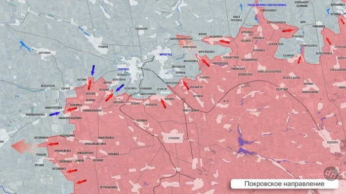 На Покровском направлении местами нелётная погода - дожди и туманы. ВС РФ пользуются снижением активности дронов ВСУ для продвижения по всему участку фронта от Богдановки до Новониколаевки и Новосергеевки. В районе Удачного ВС РФ стараются обойти позиции врага по лесополкам южнее и севернее. В Котлино наши штурмовики продвигаются в районе ферм. Наши теснят ВСУ в Зверево и в районе Леонтовичей, где противник выстраивает оборону вокруг двух терриконов. Правее идут упорнейшие бои за опорники южнее Чунишино и Новоукраинки. В районе Малиновки наши части вышли к окраинам Шевченко Первого.