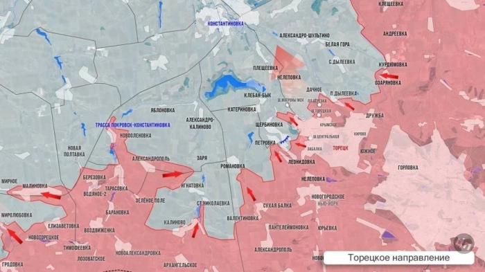 На западном фланге Торецкого направления ВС РФ продолжают рассекать оборону врага на север от Новой Полтавки. Бои приближаются к Полтавке, Попову Яру и Русину Яру. В украинских соцсетях всё больше сообщений о том, что наши операторы дронов бьют технику ВСУ на трассе из Краматорска в Доброполье. Бои продолжаются в Яблоновке, от которой до Константиновки уже меньше 10 км. Продолжаются бои в Заре и зачистка в Романовке. В Игнатовке и Старой Николаевке противник держит позиции, несмотря на то, что фактически оказался в котле.