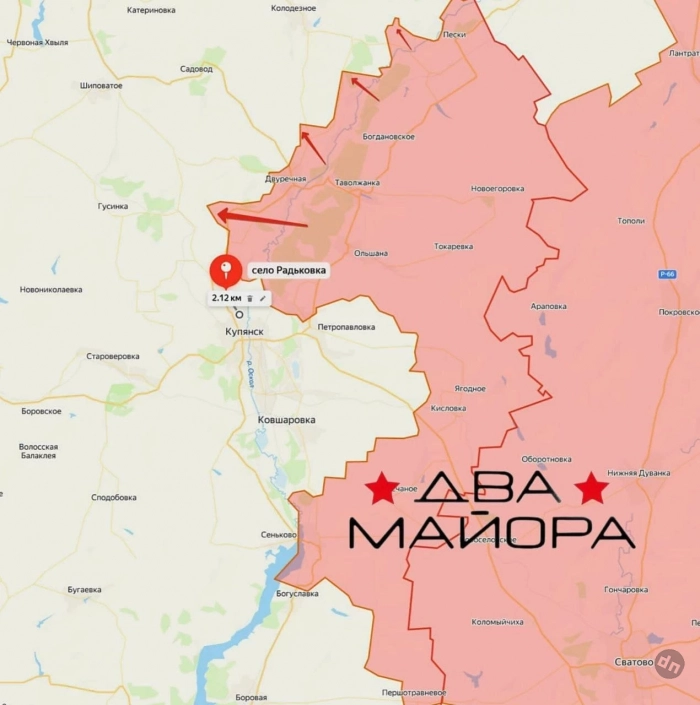 Хорошие новости поступают с Купянского направления. МО РФ сообщило об освобождении села Радьковка, что южнее Кондрашовки. От него до первых домов Купянска - около 1 км, то есть ВС РФ фактически вышли к северо-западным окраинам Купянска.