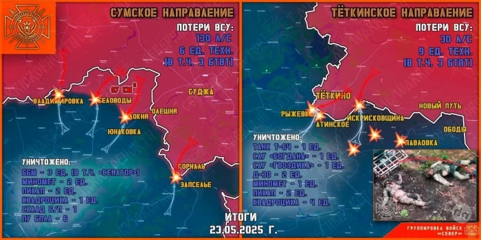 23 мая группировка войск "Север" уничтожала передовые и штурмовые подразделения противника на Тёткинском и Глушковском направлениях, продолжила создание полосы безопасности в Сумской области, передаёт "Северный ветер".