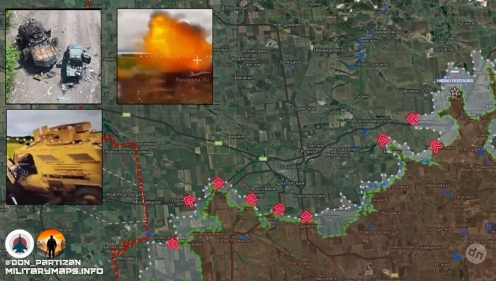 На Южно-Донецком направлении ГрВ «Восток» сообщила об освобождении н.п. Отрадное, расположенное на направлении н.п. Богатырь (недавно освобождён) - н.п. Комар. Враг бросает в контратаки пехоту на НАТОвской бронетехнике, но безуспешно. Продолжается продвижение в сторону Комара. Продолжается штурм Зеленого Поля и Новополя. Идут ожесточённые бои, сообщает Telegram-канал "Два майора".