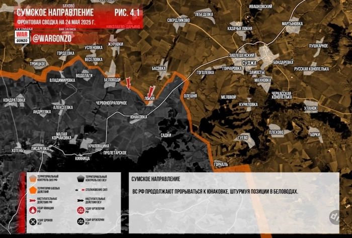 На Сумском направлении ВС РФ продолжают прорываться к Юнаковке, штурмуя позиции в Беловодах. ВСУ, в свою очередь, не оставляют попыток прорваться в районе Тёткино, практически ежедневно посылая всё новые разведывательные и штурмовые группы.