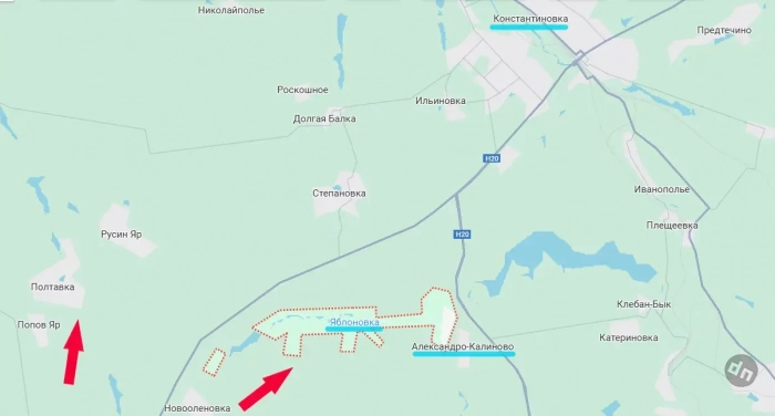 Российские войска, продвинувшись южнее реки Бычок, взяли под контроль ещё около 6-7 квадратных километров территории, расширив зону контроля у села Яблоновка. Это небольшое, но вытянутое с запада на восток село, которое фактически стыкуется с селом Александро-Калиновка, что у Клебан-Быкского водохранилища. От этих участков территории до Константиновки около 8 км.