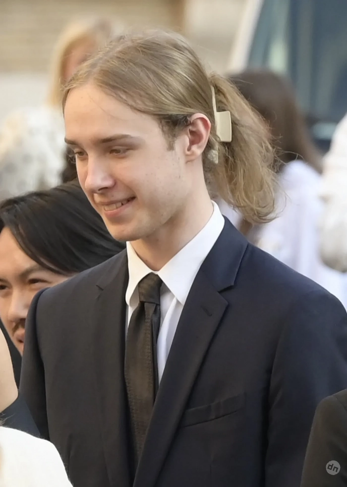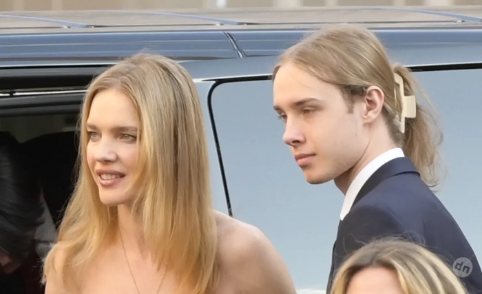 Звезду с сыном засняли во время выхода из машины. Наталья была одета в вечернее платье Valentino, а Лукас — в синий брючный костюм с галстуком. Длинные волосы наследник модели заколол "крабиком".