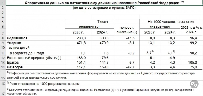 Согласно последним данным, по итогам первого квартала нынешнего года в стране родилось 288,8 тысячи младенцев, а также было зарегистрировано 151,4 тысячи бракосочетаний (при 117 тысячах разводов). Если сравнить эти цифры с данными по аналогичному периоду прошлого года, то картина выглядит пугающей – за первые три месяца 2024 года родилось 300,3 тысячи младенцев, т.е. больше, чем за первые три месяцы 2025 года. При этом ситуация с естественной убылью населения ухудшилась: в 1 квартале 2024 года было зафиксировано 179,6 тысячи смертей, а по итогам марта 2025 – 183 тысячи.