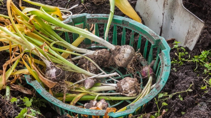 Когда все листья засохнут, луковицу следует выкопать из земли. Делать это нужно аккуратно, чтобы не повредить корень. После этого уберите остатки земли и сухие чешуйки, а затем выложите луковицы в один слой в картонную коробку. Оставьте их обсыхать в тёплом, хорошо проветриваемом помещении.