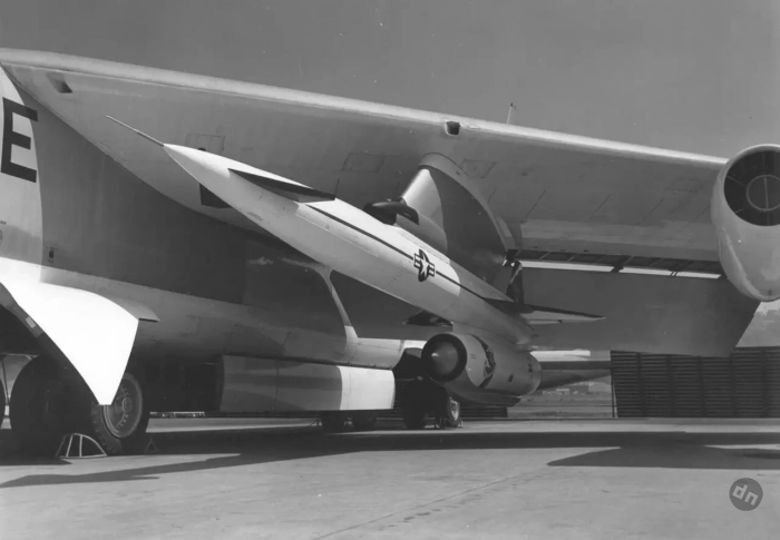 Фото 2. Ракета AGM-28 Hound Dog под крылом B-52. Огромные размеры Hound Dog ограничивали мощный B-52 нагрузкой всего в 2 ракеты, что серьезно ограничивало возможности SAC по нейтрализации советских систем ПВО.