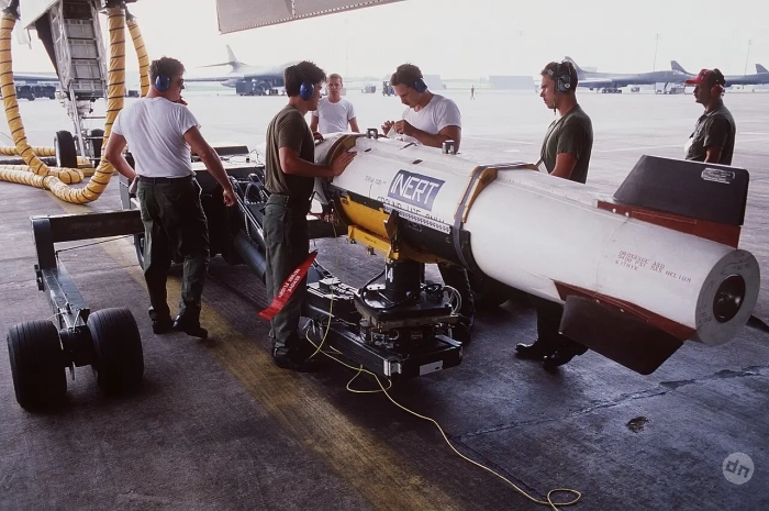 Фото 5. Инертная ракета AGM-69A SRAM осматривается членами 96-й эскадрильи по техническому обслуживанию боеприпасов под бомбовым отсеком бомбардировщика B-1B на авиабазе Дайс, штат Техас.