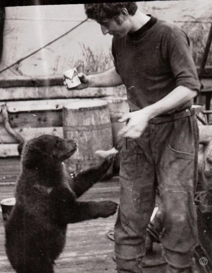 Работа на промысле была тяжелая, но интересная. Ботовые ходили к берегу на охоту, добывали горных козлов, медведей и однажды добыли лося, так что свежее мясо у нас было. По весне привозили с берега полные корзины черемши и лука — всё съедалось влёт. В конце июня появилась талая вода на льдинах, и мы запасались пресняком. В Аяне, Инюхе ходили в «гастроном», меняя шкурки на курево и спиртное. И на другой день все были как штык — сказывалась закалка! Был на «Лахтаке» медвежонок Яшка, ботовые привезли с берега…. Поначалу он скучал, потом прижился и был любимцем команды. К осени он подрос, и его отдали в цирк во Владивостоке…