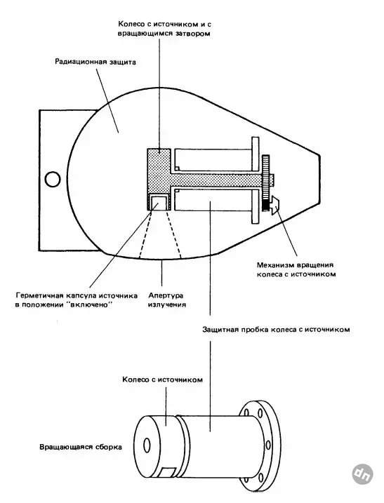 Капсула с радиоактивным веществом размещена на колесе источника, изготовленном из свинца и нержавеющей стали, образуя механизм с вращающимся затвором. Для выхода излучения наружу производится вращение затвора электромотором, с тем чтобы совместить капсулу с аппаратурой излучения — отверстием выхода пучка. Между вращающимся затвором и приводом электромотора находится цилиндрическая защитная пробка. Эти элементы в целом называются вращающейся сборкой.