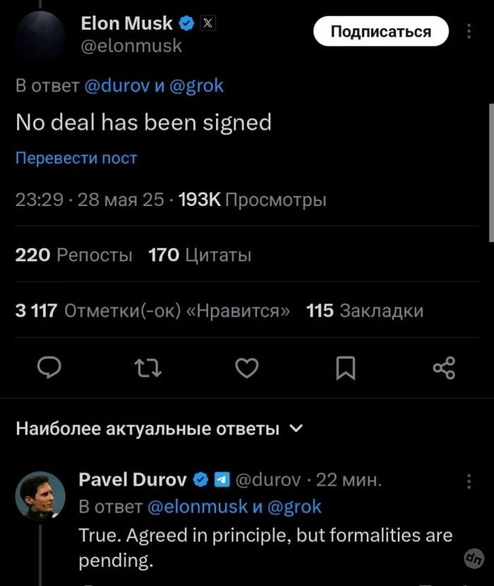 После объявления Дурова о коллаборации с Маском в Х под его постом Илон сделал замечание Павлу. "Сделка не была подписана", — прокомментировал Маск пост Дурова.