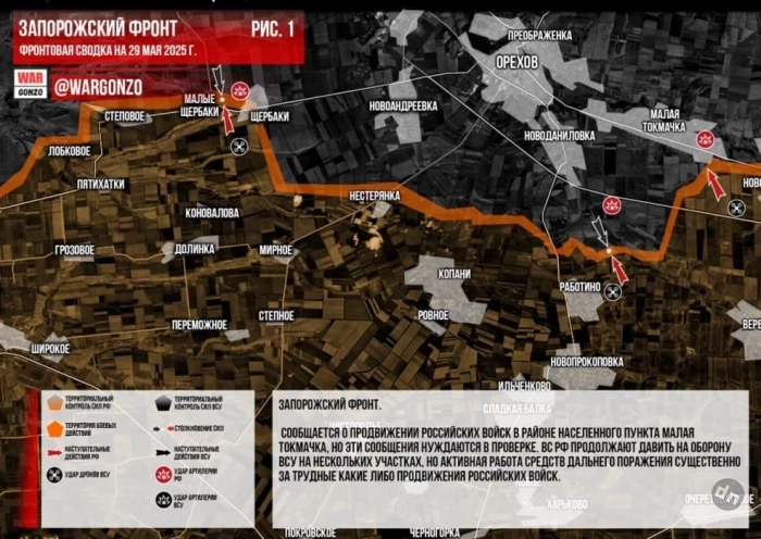 На Запорожском направлении, как отмечает Telegram-канал Wargonzo, имеет место продвижение российских войск в районе населённого пункта Малая Токмачка, но эти сообщения нуждаются в проверке. ВС РФ продолжают давить на оборону ВСУ на нескольких участках, но активная работа средств дальнего поражения существенно за трудные какие либо продвижения российских войск.