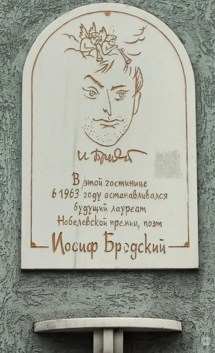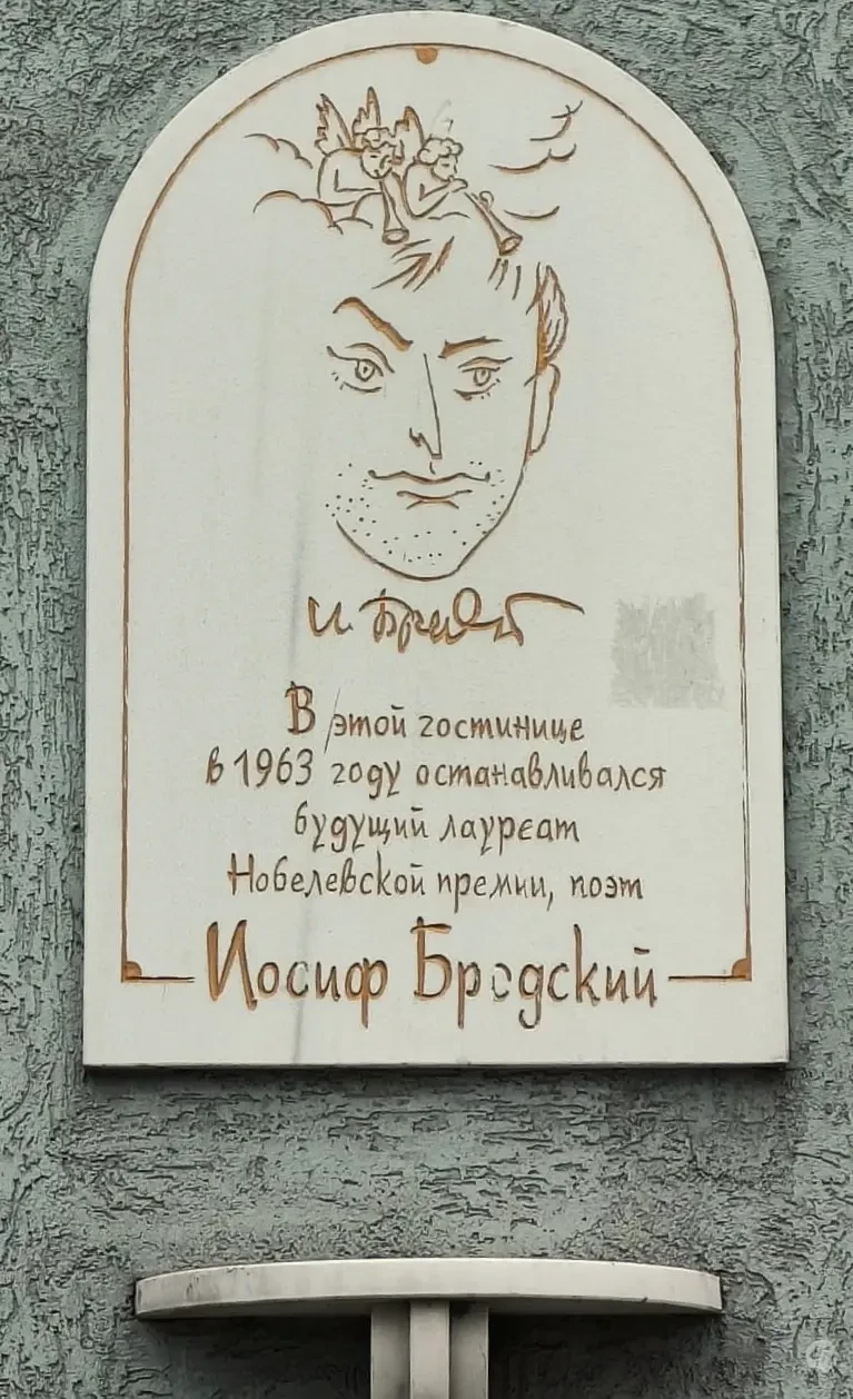 И совсем неожиданно на военно-морской базе, которая прежде была наглухо закрыта для посторонних, увидеть мемориальную доску Иосифу Бродскому. Она извещала, что в 1963 году здесь, в гостинице «Золотой Якорь», побывал будущий Нобелиат. На мраморной доске также высечен неунывающий образ этакого весельчака.